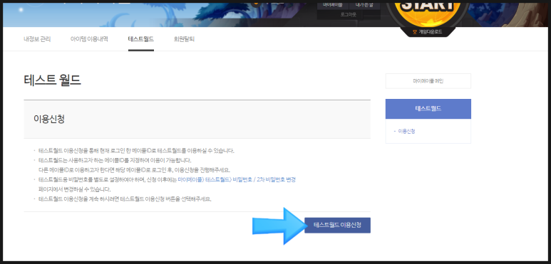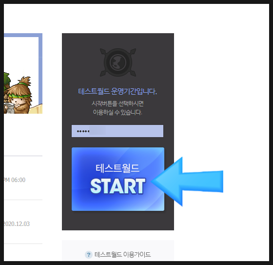 6. 아까 지정한 비밀번호를 입력하고 '테스트월드 START'클릭