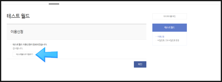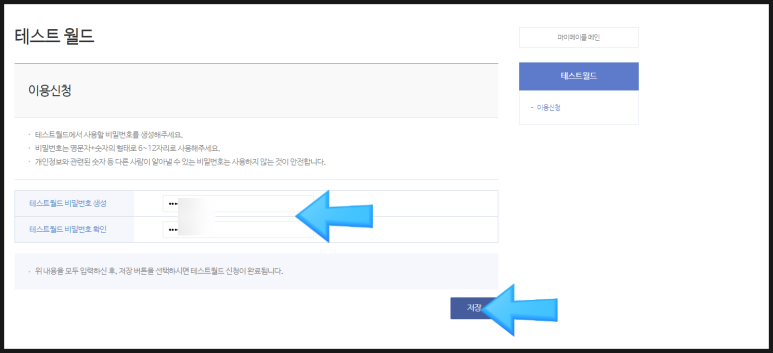 4. 테스트월드에서 사용할 비밀번호 설정후 '저장' 클릭