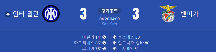 양팀 서로 주고받으며 3대3 스코어 나왔지만 인터밀란이 합산스코어 5대3으로 4강에 진출합니다.