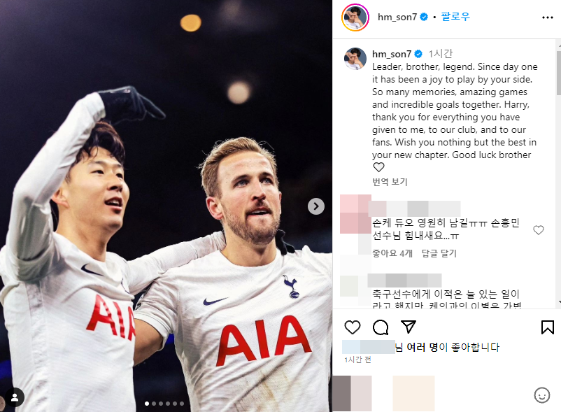 손흥민 선수가 바이에른 뮌헨으로 이적한 케인에게 짧은 메시지를 전했습니다.