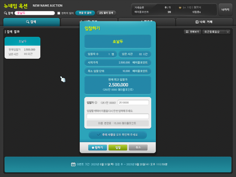 메이플 닉네임 거래소인 '뉴네임 옥션'에서 진행되고 있는 메호대전?