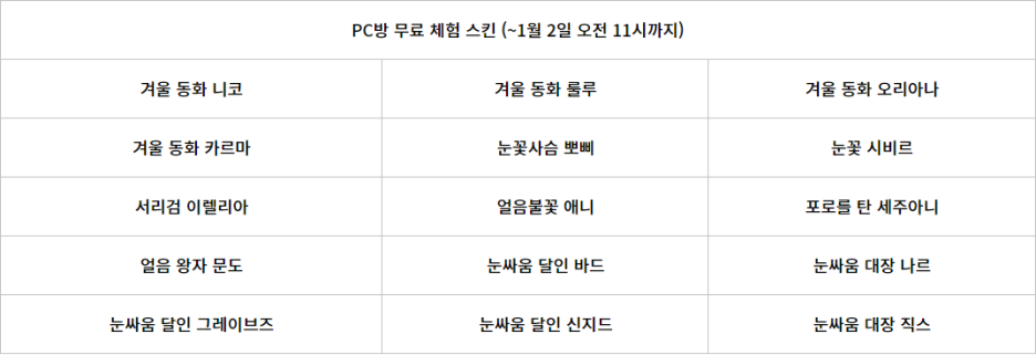 11월 30일 오전 11시부터 2024년 1월 2일 오전 11시까지 겨울 스킨 15종을 PC방에서 무료로 체험해 보실 수 있습니다.
