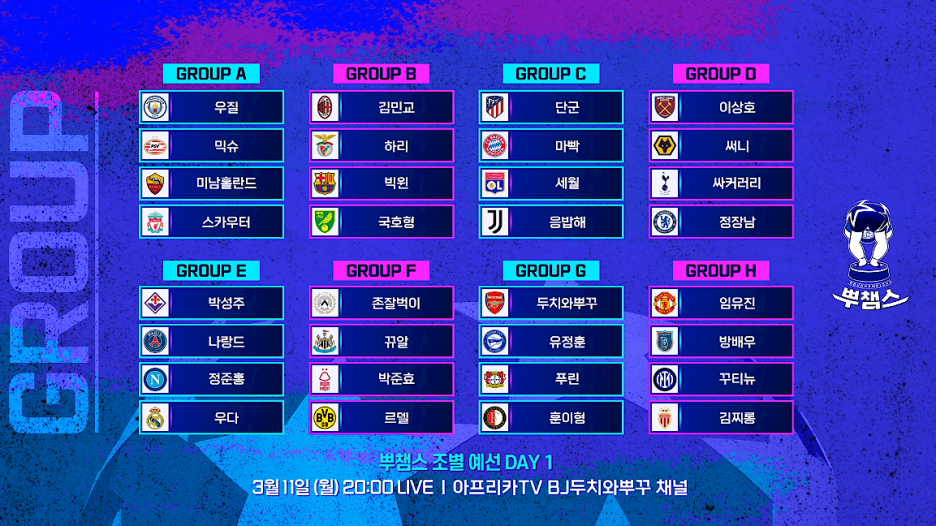 두치와뿌꾸가 진행하는 피파 뿌챔스 조가 편성되었습니다.
