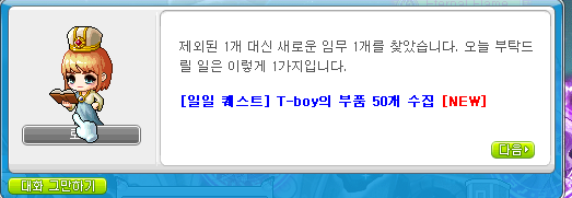 이번에 새롭게 추가된 일퀘 입니다. 그것은 바로 "티보이의 부품 50개 수집"