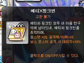 누르면 이렇게 예티x핑크빈 칭호를 얻을 수 있습니다.