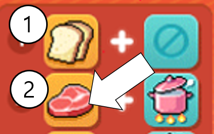 1. 빵을 넣고 > 2. 고기를 넣고 > 3. 냄비를 넣고 > 4. 고기를 넣고 > 5. 냄비를 넣고 > 6.빵을 넣음