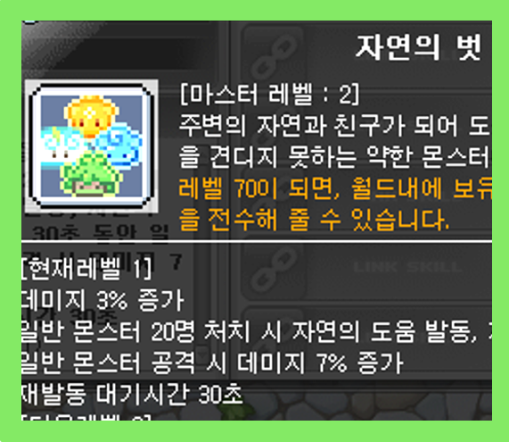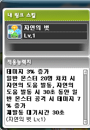 [마스터 레벨2] : '일반 몬스터 20명 처치 시 자연의 도움 발동, 자연의 도움 발동시 30초 동안 일반 몬스터 공격시 데미지 11% 증가' (재발동 대기시간 30초)