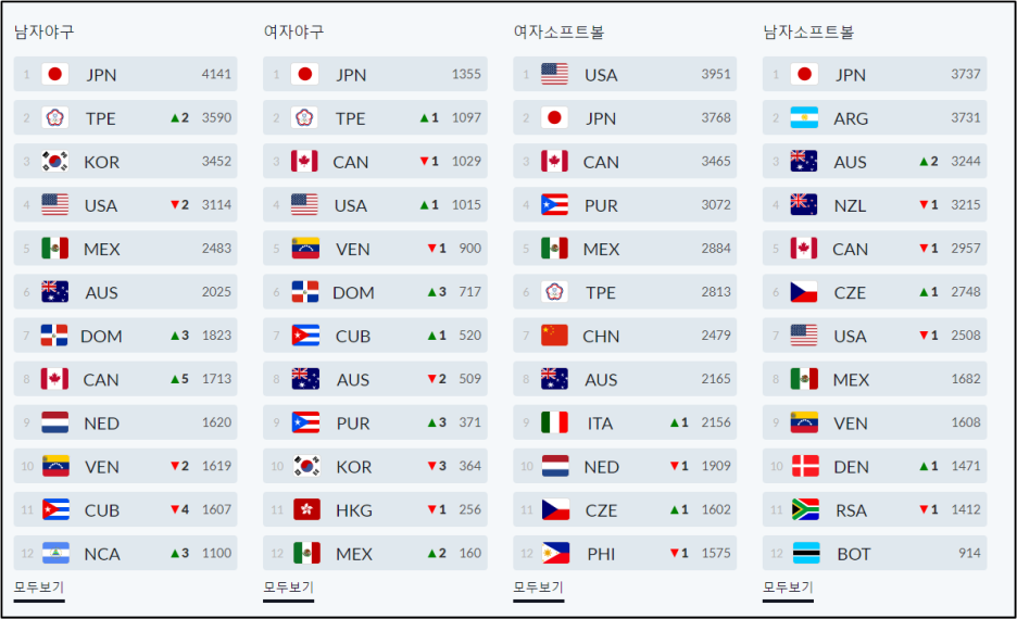국가별 랭킹을 살펴보면 남자 야구에서는 일본 1위, 대만 2위, 한국 3위가 되겠습니다.