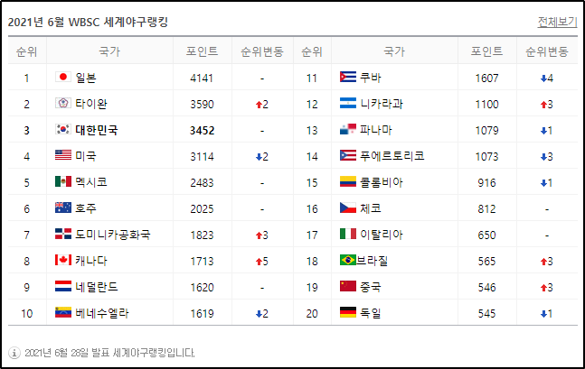 축구에서도 '피파 랭킹'이 있듯이 야구에서도 'WBSC 랭킹'이 있습니다.