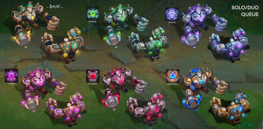 언제나처럼 개인/2인 또는 자유 랭크 게임에서 골드 이상의 티어로 이번 시즌을 마무리하셨다면 승리의 블리츠크랭크(챔피언 미보유 시 블리츠크랭크 포함)를 받습니다. 추가로 개인/2인 랭크 게임 또는 자유 랭크 게임을 골드보다 높은 티어로 달성하셨다면 각 티어에 해당하는 승리의 블리츠크랭크 크로마도 지급됩니다. 랭크 게임에서 홀로 또는 친구와 함께 달성하신 업적을 따로 기념할 수 있도록 두 랭크 게임의 티어별 크로마는 비슷하면서도 약간 다릅니다!