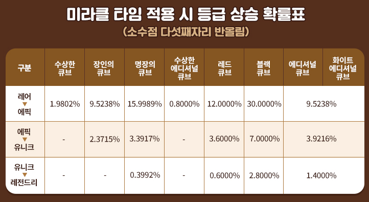 다음은 미라클 타임 적용시 큐브 확률입니다!