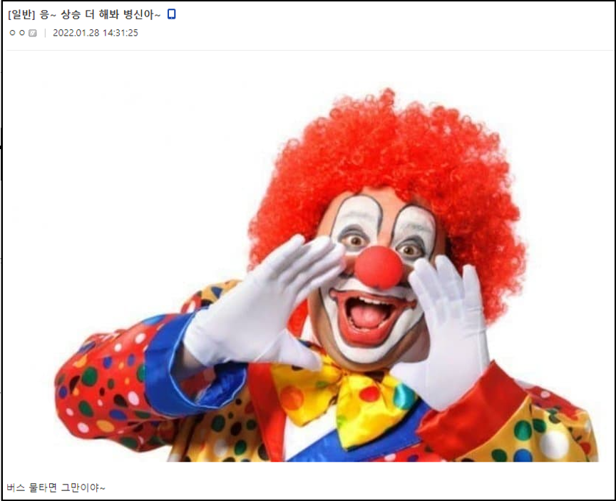 한 익명의 유저가 "응 폭락해봐 병X아 ㅋㅋㅋ" , "자X 하면 그만이야 ㅋㅋㅋ"라고 쓰며 '광대 사진'을 함께 올렸다.