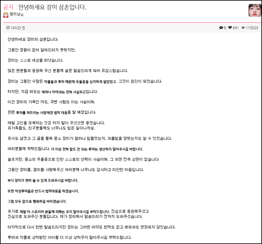 금일 새벽 트위치 게시판 '트게더'에서는 "안녕하세요 장미 삼촌입니다."라고 글이 올라왔으며, "그동안 수많은 악플들과 루머 때문에 우울증을 심각하게 앓았었고, 그것이 원인이 되었습니다"라고 전했다.