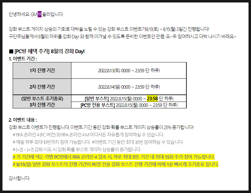 피파4 8월 강화데이 알려드립니다!