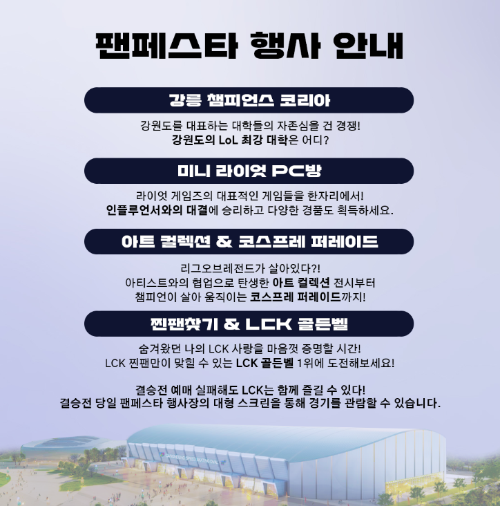 8월 27일 (토)에 LCK FAN FESTA가 스피드 스케이팅 경기장에서 개최됩니다. 다양한 부대 행사와 상품이 여러분을 기다리고 있습니다. 많은 관심 부탁드립니다. 자세한 내용은 롤백과사전님의 영상을 참고해주세요.