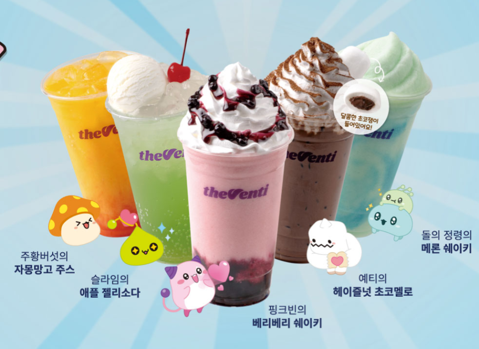 콜라보 음료 종류는 '자몽망고 주스, 애플 젤리소다, 베리베리 쉐이키, 헤이즐넛 초코멜로, 메론 쉐이키' 총 5종으로 각 4600원에 구매 할 수 있습니다~~
