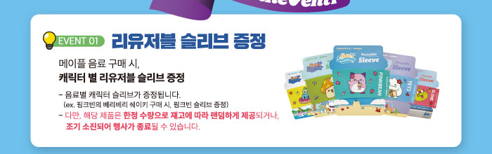 첫번째 이벤트는 음료 구매시 캐릭터 별 슬리브가 증정됩니다.