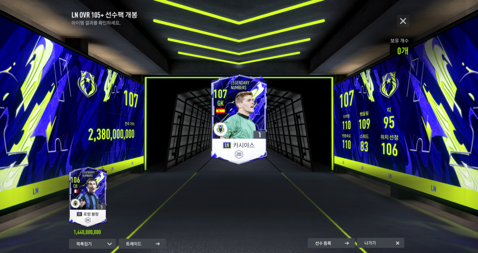 이어서 LN 오버롤 105 선수팩 두장!!