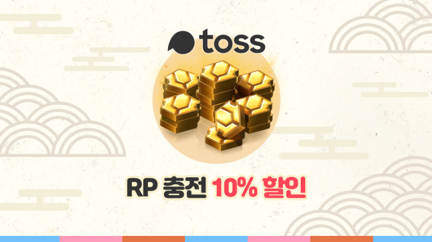■ 이벤트 기간 동안 토스(Toss)로 RP를 충전하면 10% 할인을 받을 수 있습니다. 한정 이벤트인 만큼, 이벤트가 조기 종료되면 해당 공지사항을 통해 안내해드리도록 하겠습니다.
