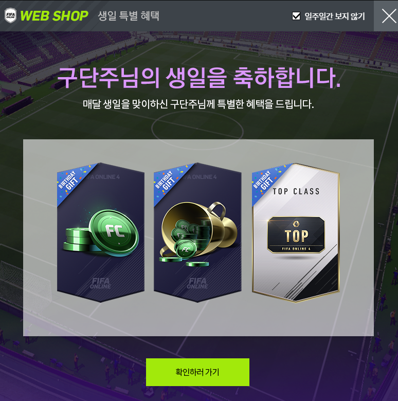 자신의 넥슨 계정에서 생일이 된 달에 피파에 로그인하면 아래와 같이 생일 특별 혜택이 팝업창으로 뜹니다.