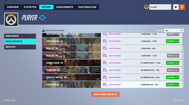 이 보고서는 이번에 오버워치에 접속하여 플레이한 모든 경기의 정보를 게임 모드별로 모아서 보여 줍니다. 특정 경기를 선택하면 경기에서 거둔 성적, 사용했던 영웅, 그 외의 경기 정보를 포함하는 통계가 표시됩니다.