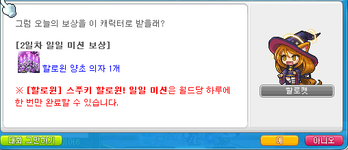 메이플 '스푸키 할로윈 이벤트' 2일차 미션을 끝내고 '할로윈 양초 의자'를 얻었습니다!