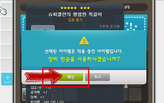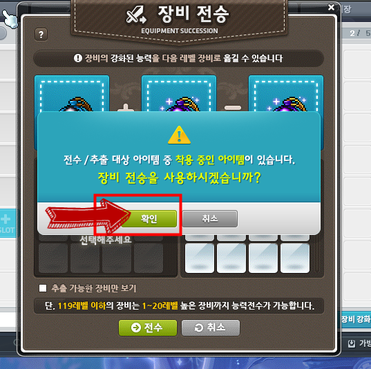 7. 장비 전승을 사용하시겠습니까? '확인' 클릭