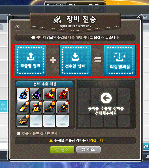 2. 추출할 장비, 전수할 장비, 최종 결과물 상태창이 보입니다.